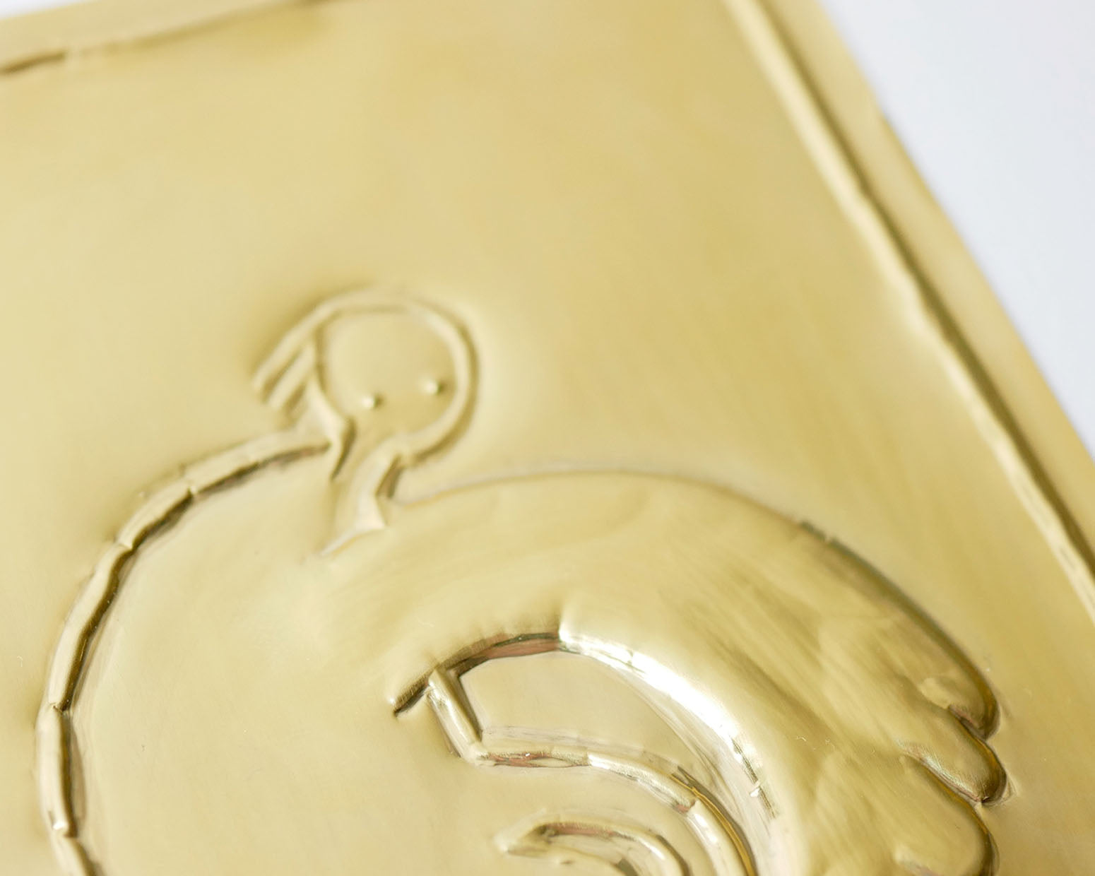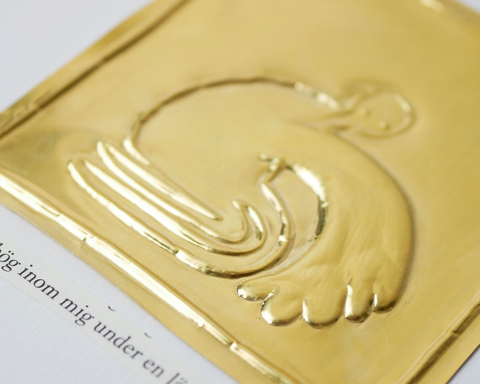 Varje verk är präglat för hand i mässingsplåt och monterat på syrafritt akvarellpapper (180 gsm). En mening, omsorgsfullt vald ur en bok, förstärker motivet. Alla verk är original – det finns bara ett av varje.