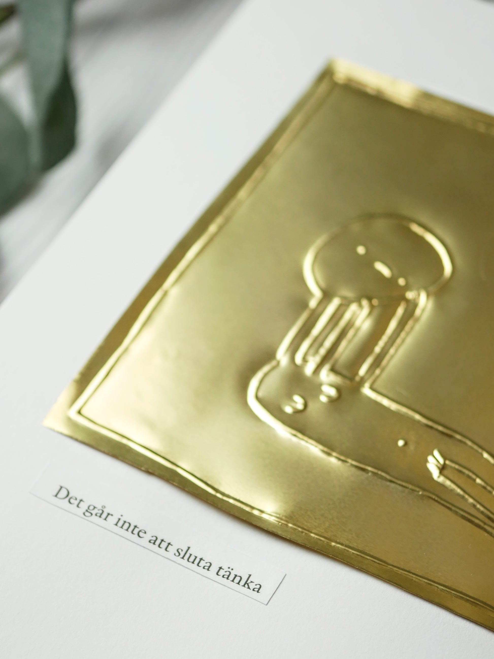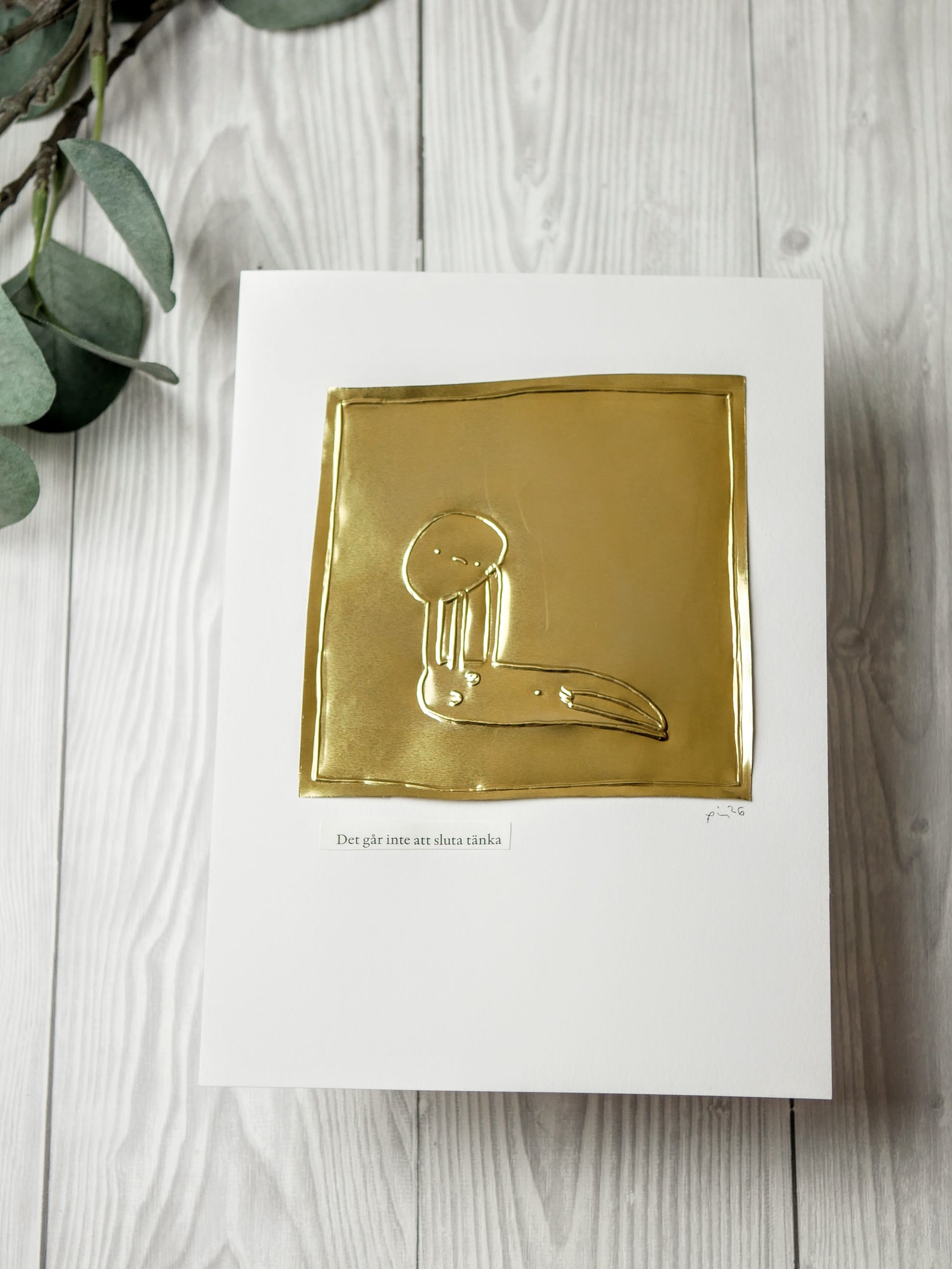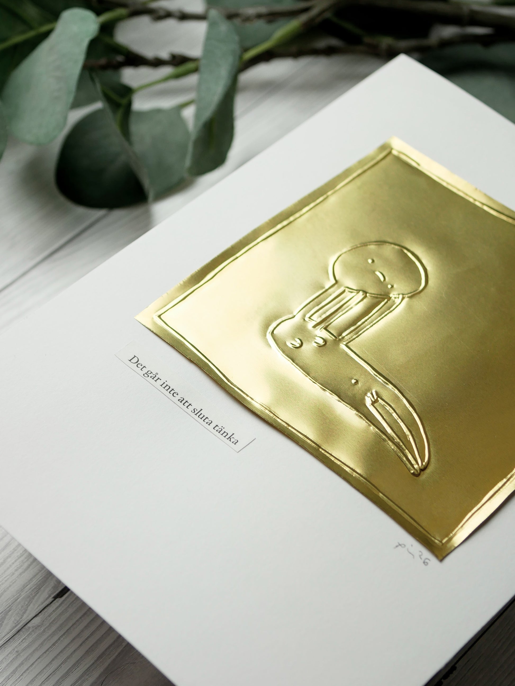 Varje verk är präglat för hand i mässingsplåt och monterat på syrafritt akvarellpapper (180 gsm). En mening, omsorgsfullt vald ur en bok, förstärker motivet. Alla verk är original – det finns bara ett av varje.