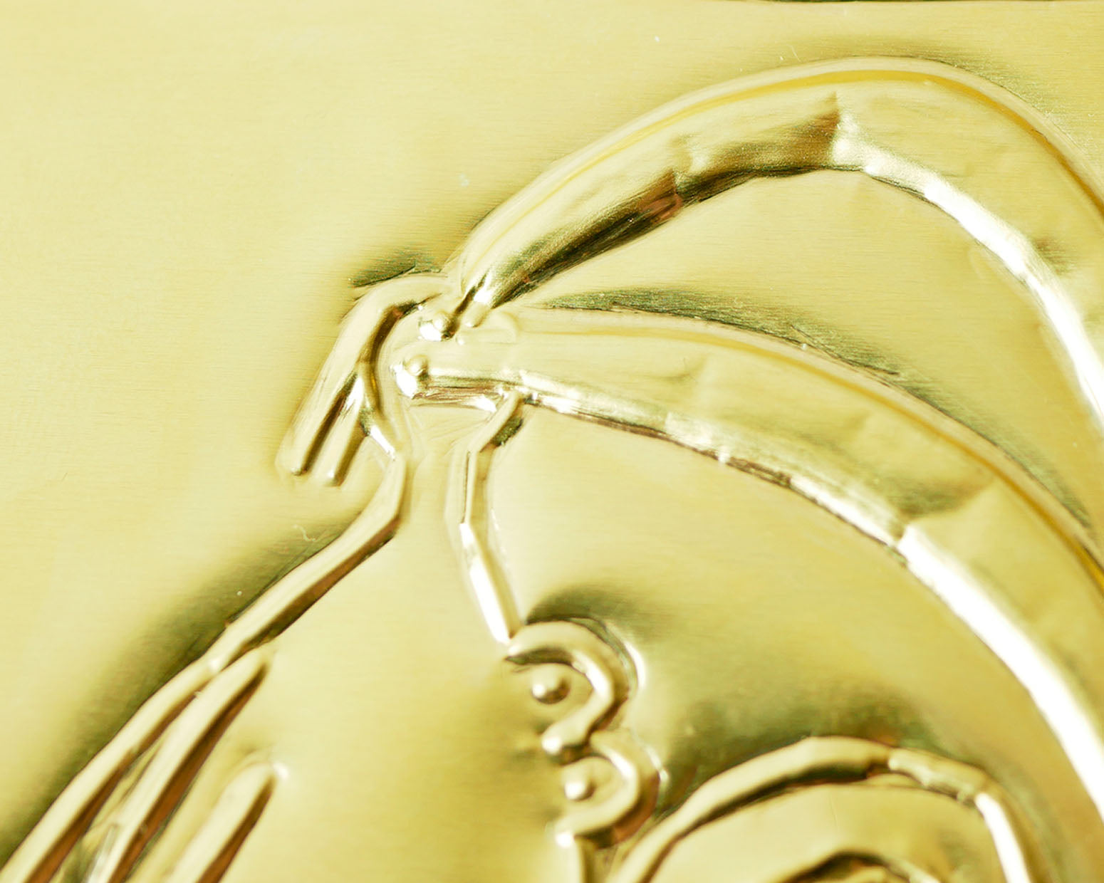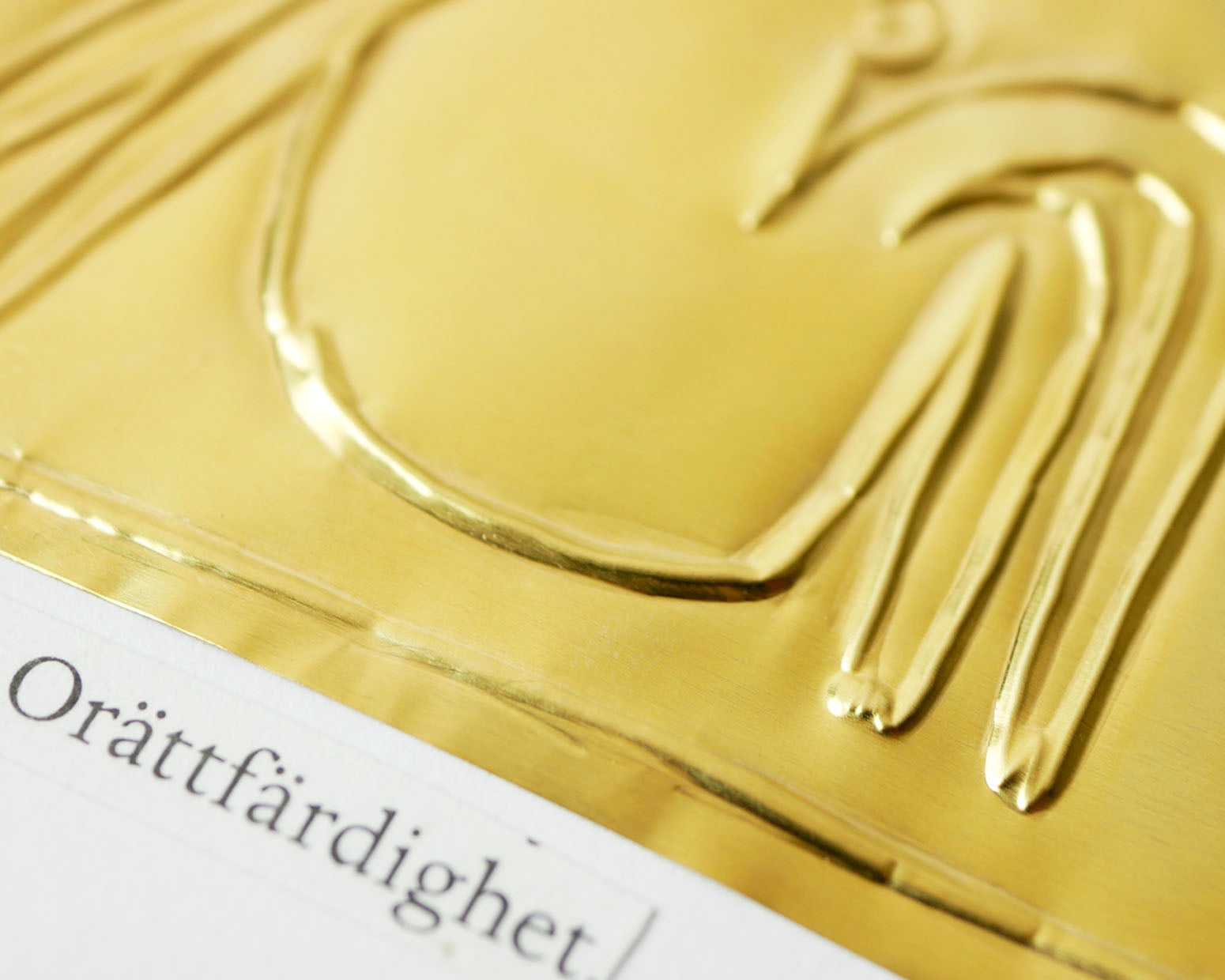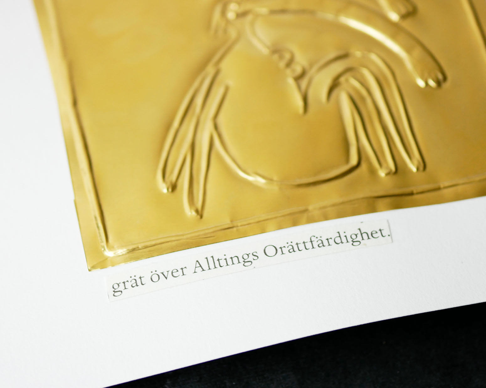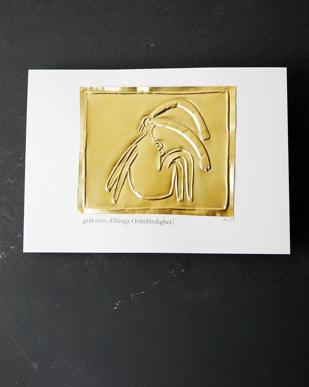Varje verk är präglat för hand i mässingsplåt och monterat på syrafritt akvarellpapper (180 gsm). En mening, omsorgsfullt vald ur en bok, förstärker motivet. Alla verk är original – det finns bara ett av varje.