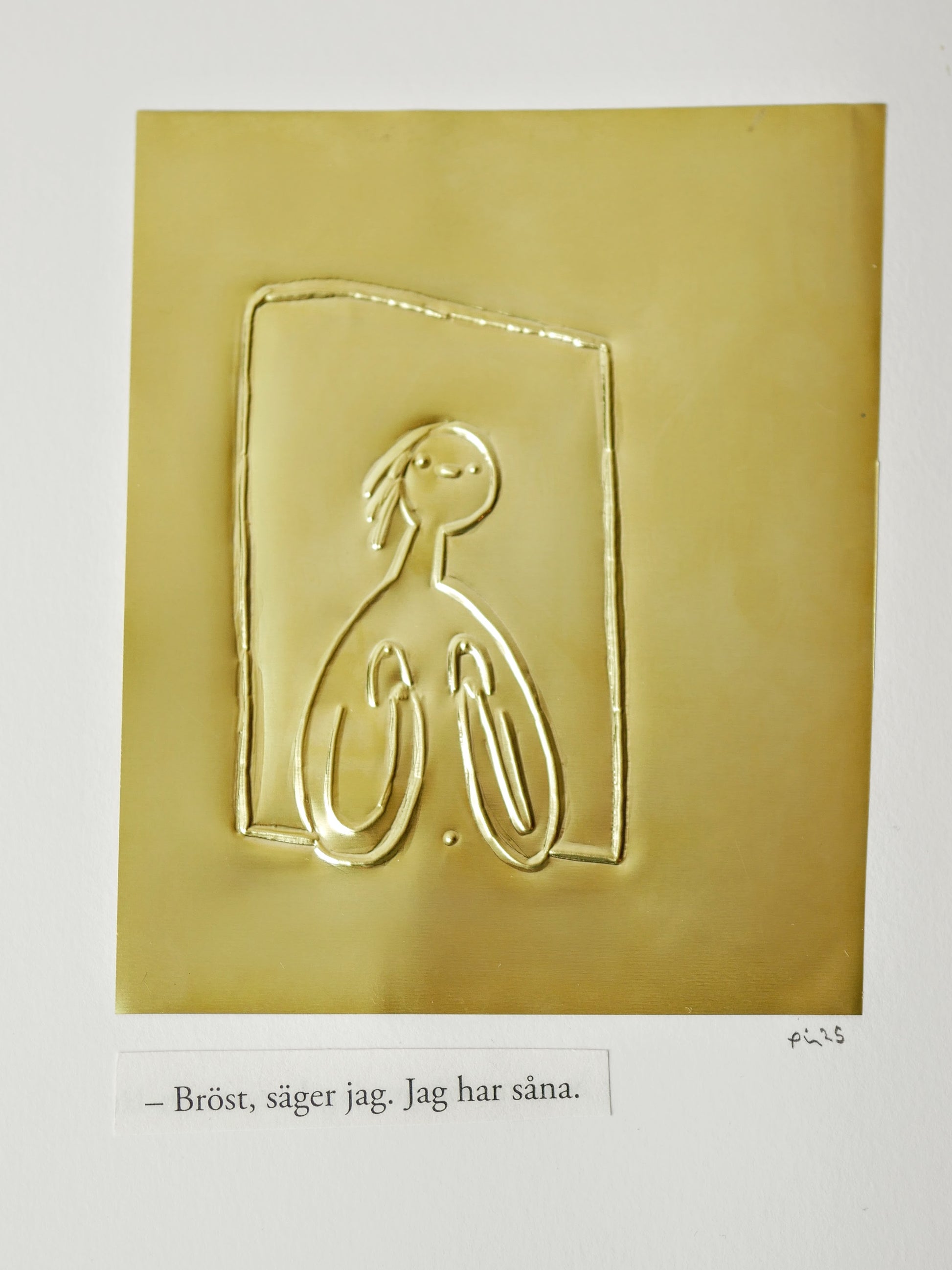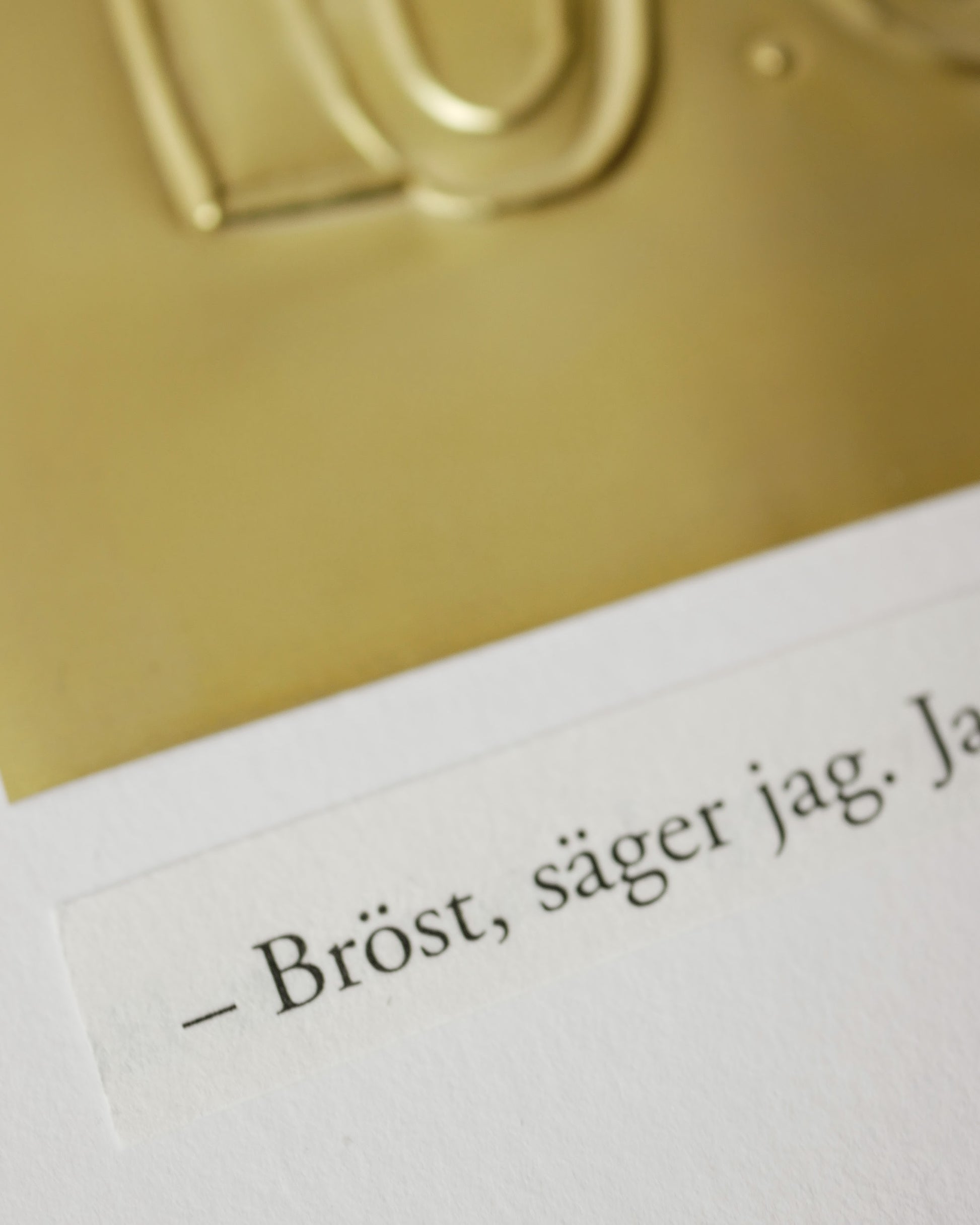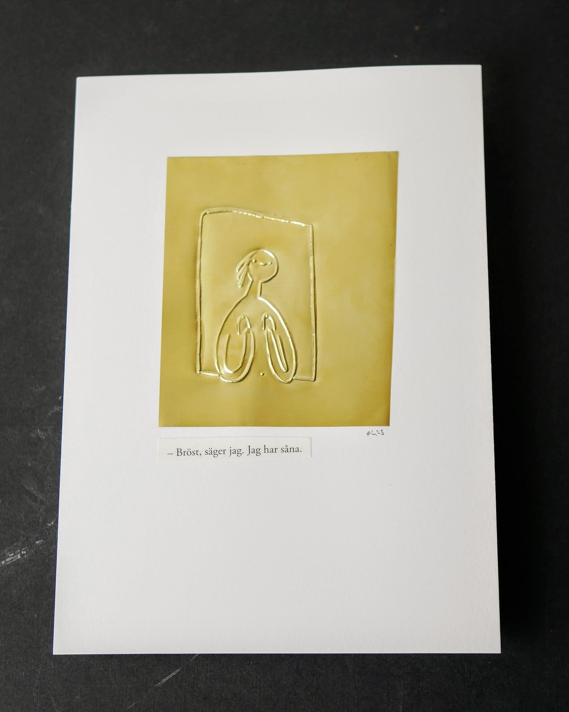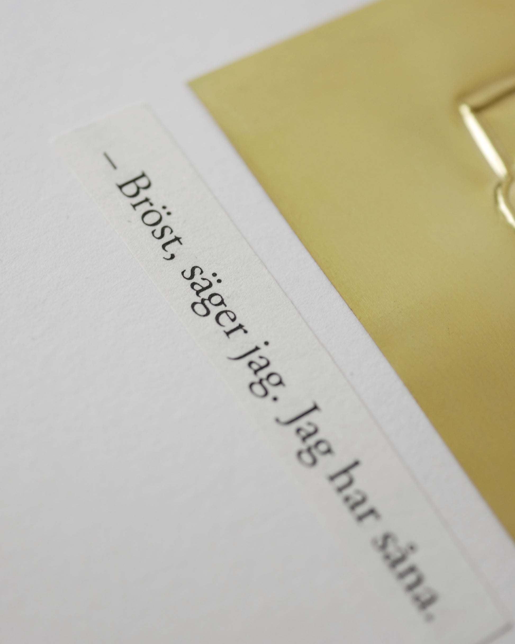 Varje verk är präglat för hand i mässingsplåt och monterat på syrafritt akvarellpapper (180 gsm). En mening, omsorgsfullt vald ur en bok, förstärker motivet. Alla verk är original – det finns bara ett av varje.
