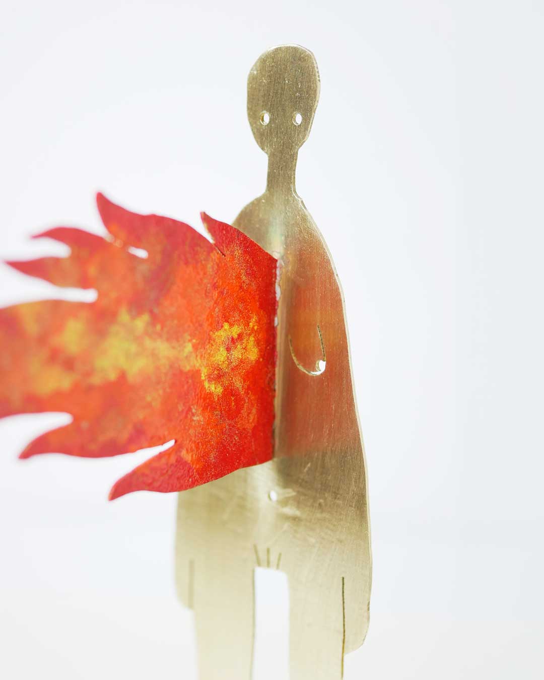 Brinnande passion, outtömlig styrka. Denna skulptur fångar den kraft som bor inom oss alla – en eld som flammar upp från bröstet och sprider ljus i mörkret.