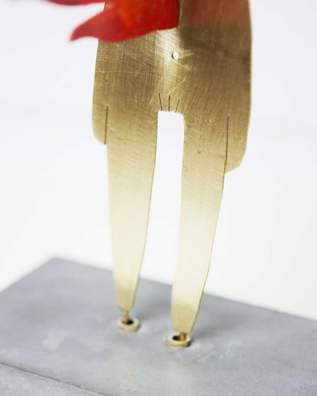 Mina skulpturer är gjorda i mässing med en bas av pigmenterad betong som därefter behandlats med vax för att skapa en glansig yta. Kontrasten mellan mässingens glans och betongens robusta textur ger varje skulptur en distinkt och tidlös skönhet. Jag tycker att dessa material kompletterar varandra perfekt, och ger varje skulptur en unik estetik som kommer att lysa upp ditt hem.