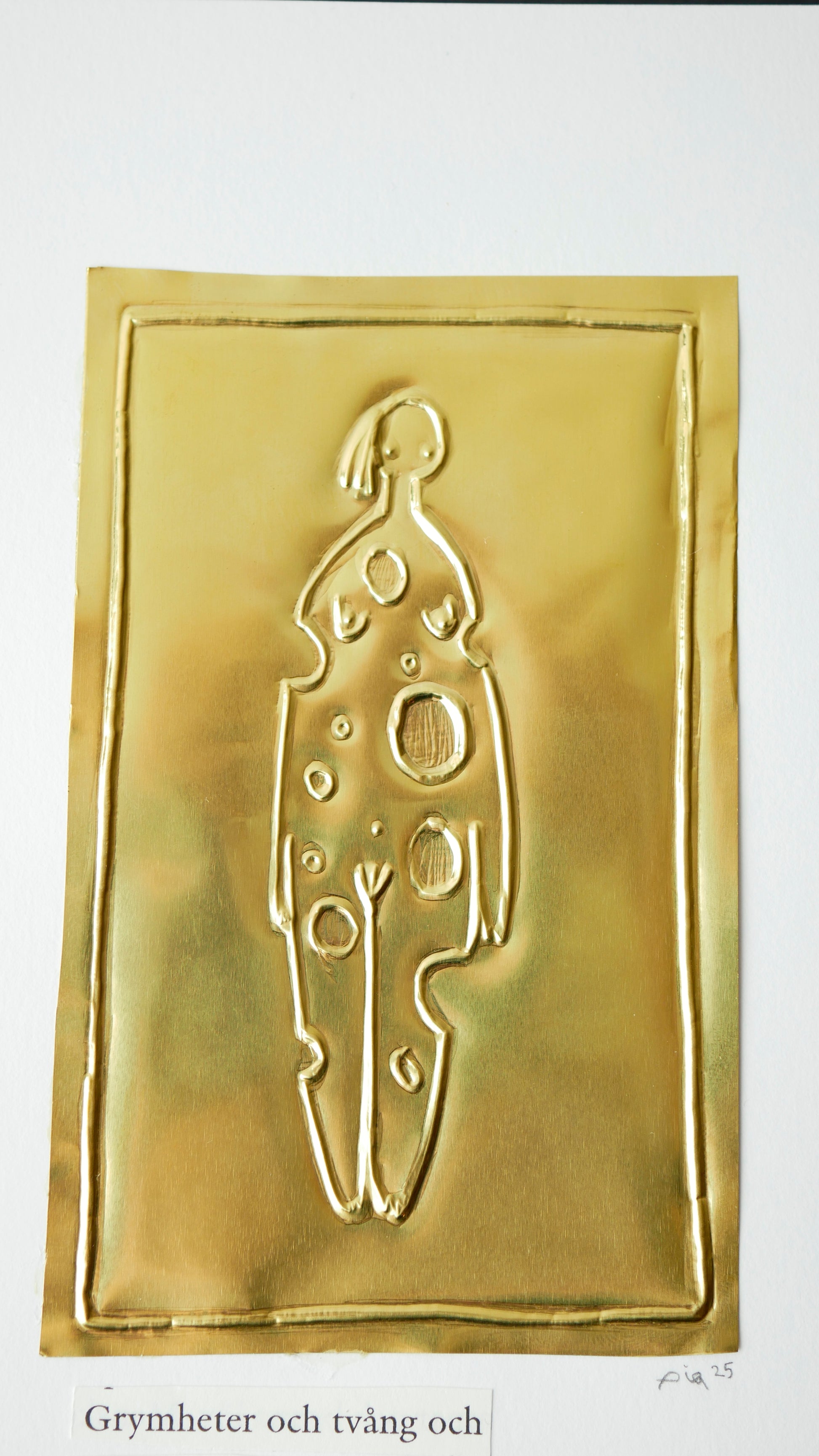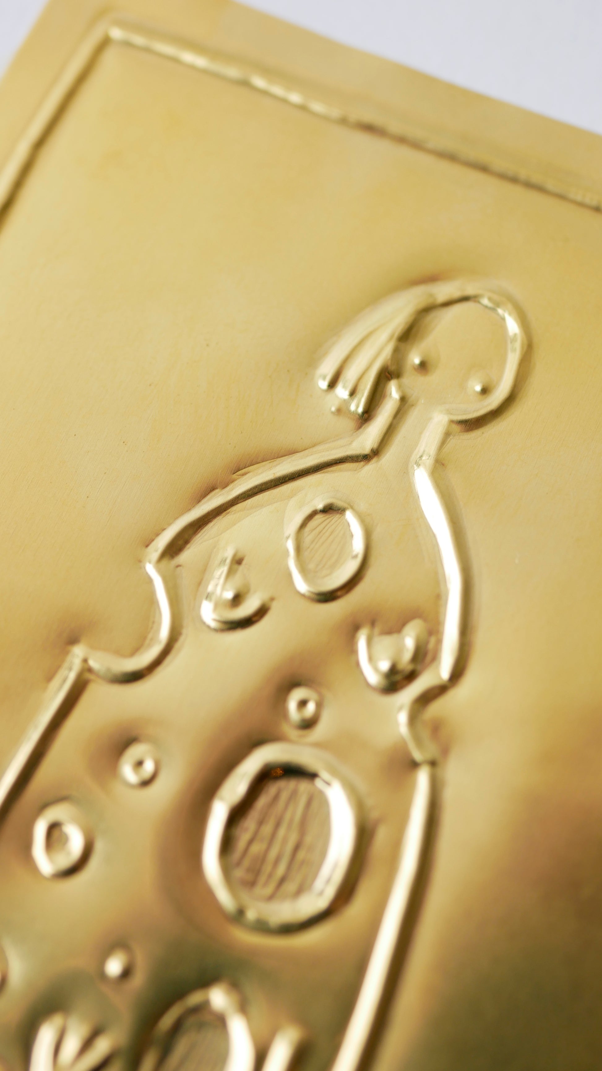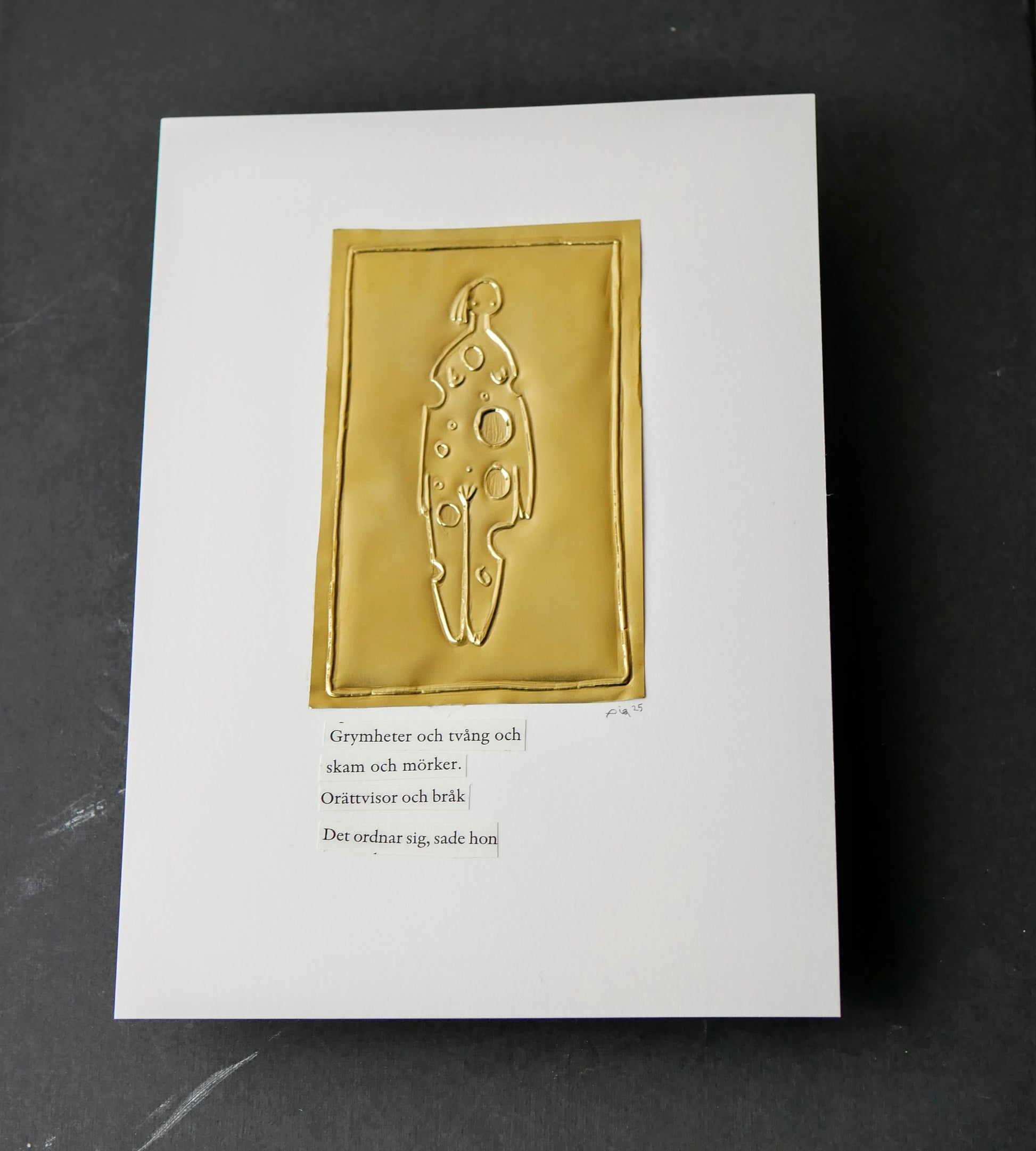 Varje verk är präglat för hand i mässingsplåt och monterat på syrafritt akvarellpapper (180 gsm). En mening, omsorgsfullt vald ur en bok, förstärker motivet. Alla verk är original – det finns bara ett av varje.