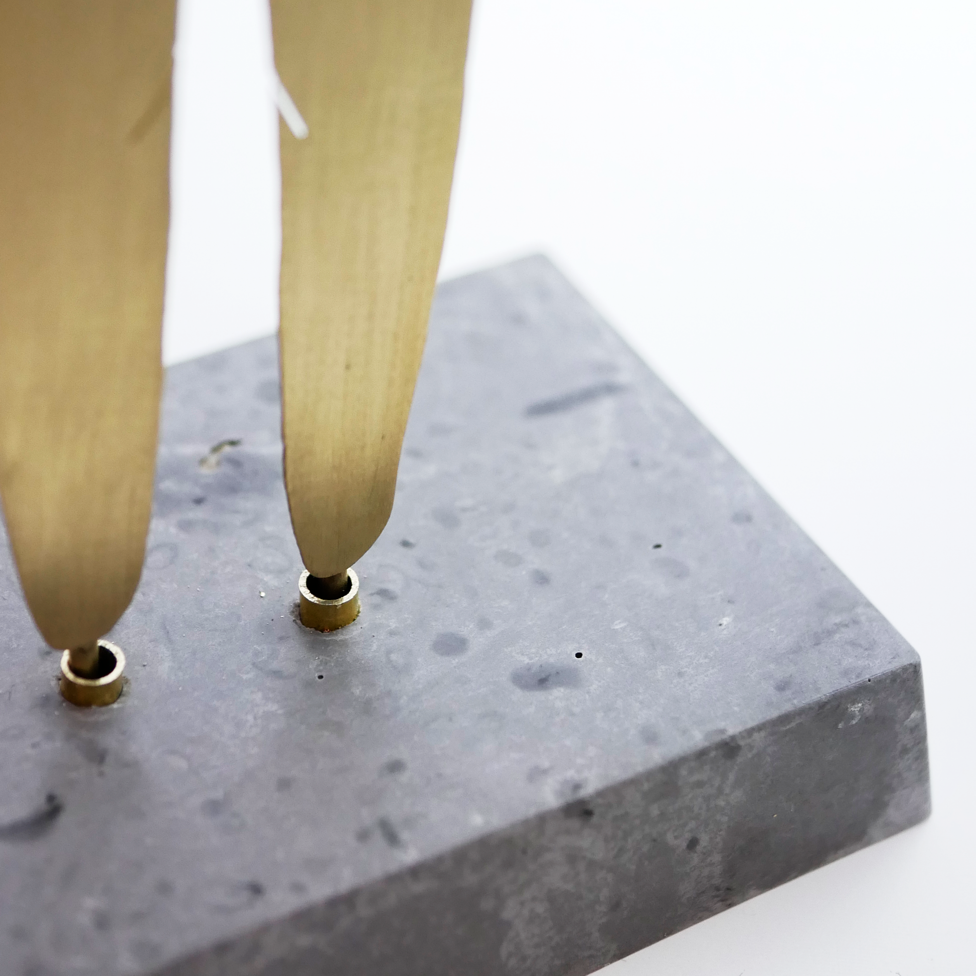 Mina skulpturer är gjorda i mässing med en betongliknande bas som behandlats med vax för att skapa en glansig yta. Kontrasten mellan mässingens glans och basens robusta textur ger varje skulptur en distinkt och tidlös skönhet. Jag tycker att dessa material kompletterar varandra perfekt, och ger varje skulptur en unik estetik som kommer att lysa upp ditt hem.