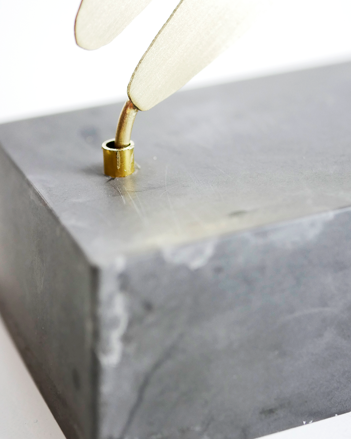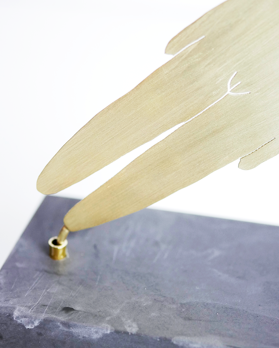 Mina skulpturer är gjorda i mässing med en betongliknande bas som behandlats med vax för att skapa en glansig yta. Kontrasten mellan mässingens glans och basens robusta textur ger varje skulptur en distinkt och tidlös skönhet. Jag tycker att dessa material kompletterar varandra perfekt, och ger varje skulptur en unik estetik som kommer att lysa upp ditt hem.