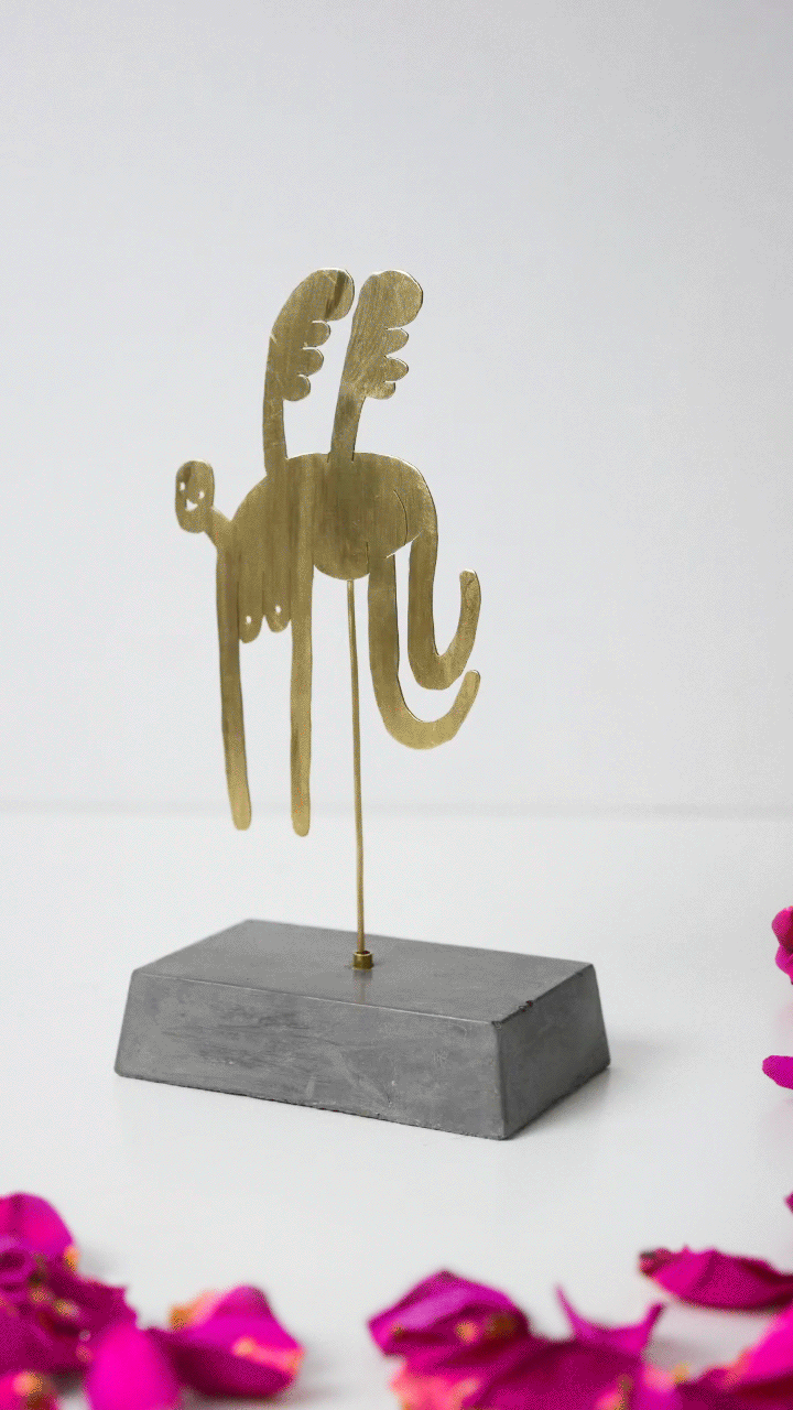 Mina skulpturer är gjorda i mässing med en bas av pigmenterad betong som därefter behandlats med vax för att skapa en glansig yta. Kontrasten mellan mässingens glans och betongens robusta textur ger varje skulptur en distinkt och tidlös skönhet. Jag tycker att dessa material kompletterar varandra perfekt, och ger varje skulptur en unik estetik som kommer att lysa upp ditt hem.
