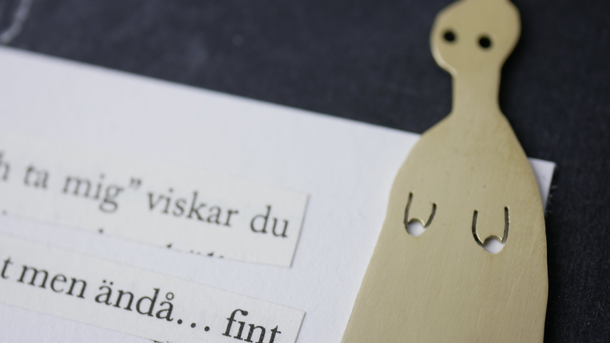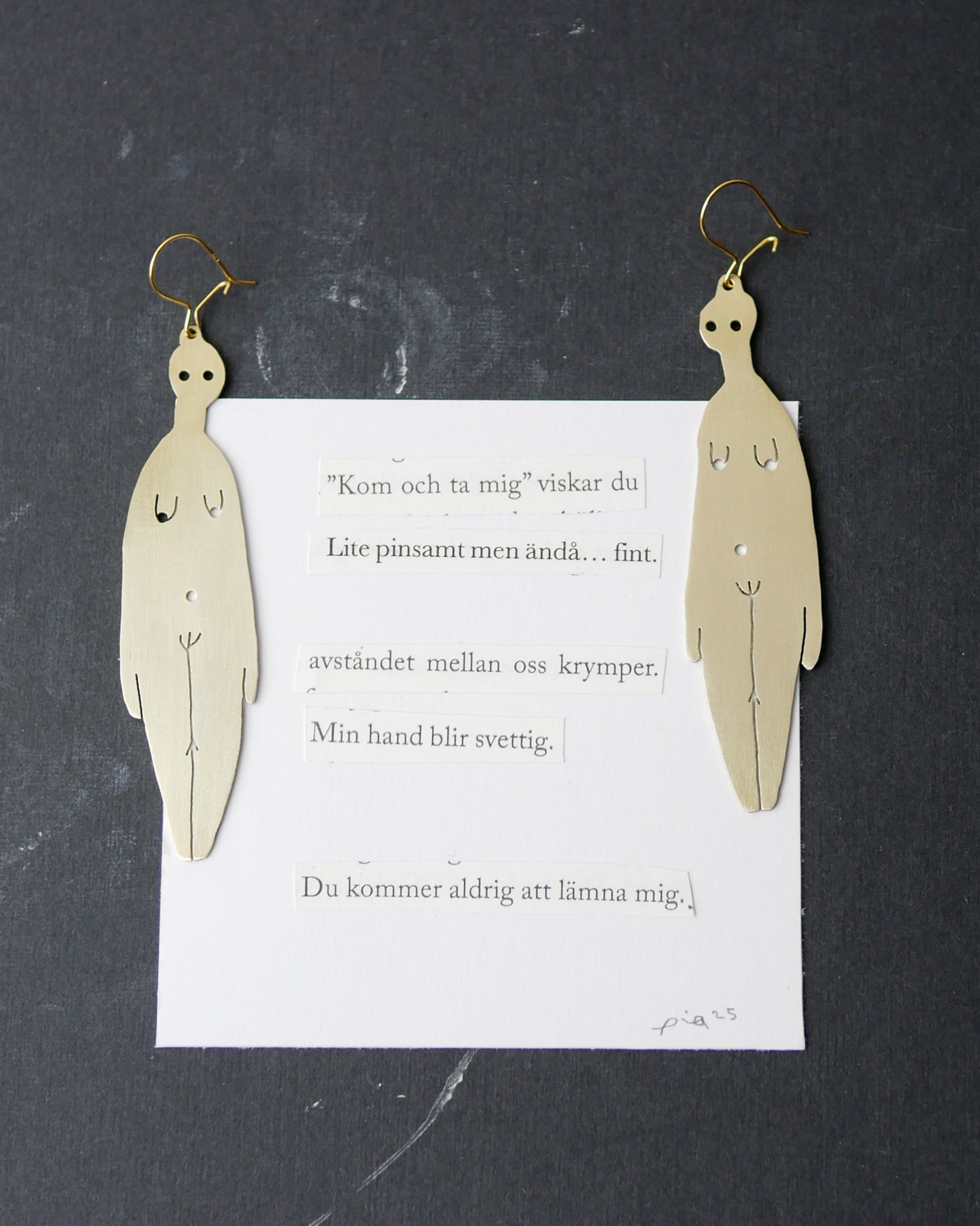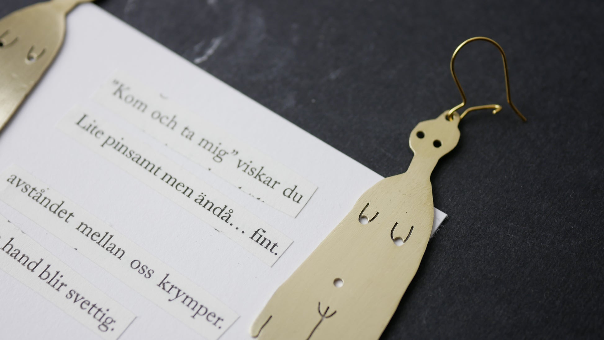 Örhängen i mässing, helt unika. Tillhörande dikt med utklippta meningar monterat på akvarellpapper. Signerat av mig.