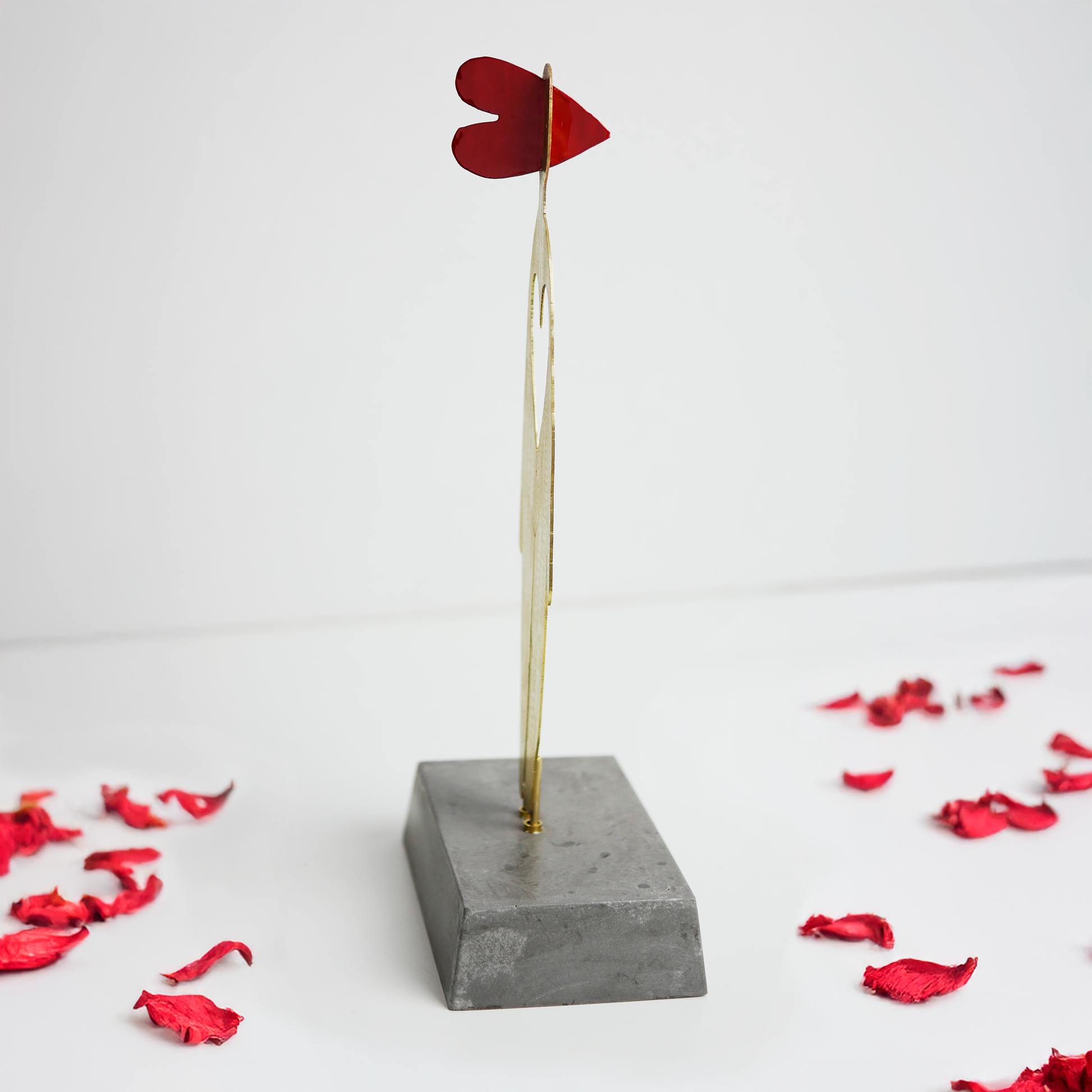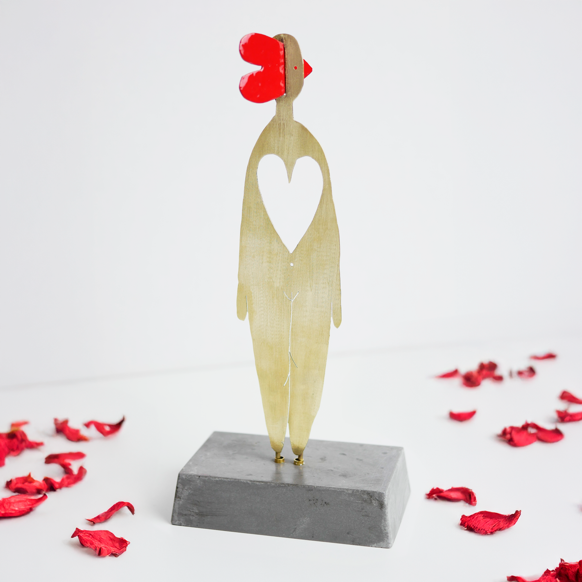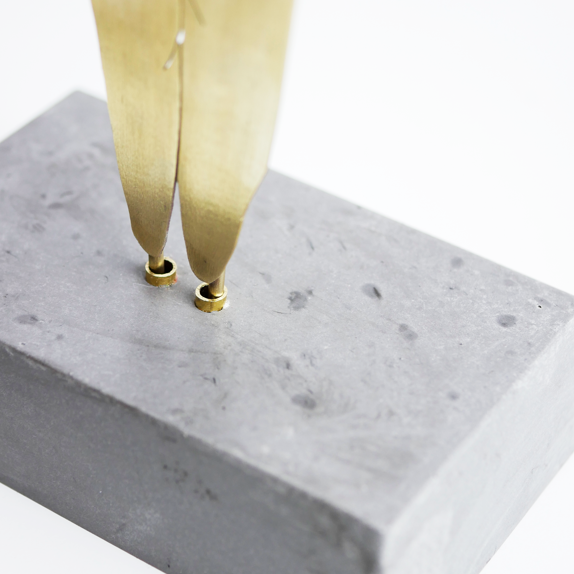 Mina skulpturer är gjorda i mässing med en betongliknande bas som behandlats med vax för att skapa en glansig yta. Kontrasten mellan mässingens glans och basens robusta textur ger varje skulptur en distinkt och tidlös skönhet. Jag tycker att dessa material kompletterar varandra perfekt, och ger varje skulptur en unik estetik som kommer att lysa upp ditt hem.